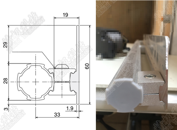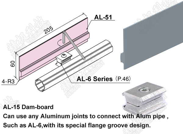Also can be arranged to cut into little piece with socket behind to fixed in any place of Aluminum pipe rack system or work bench ,with its special flange groove design.